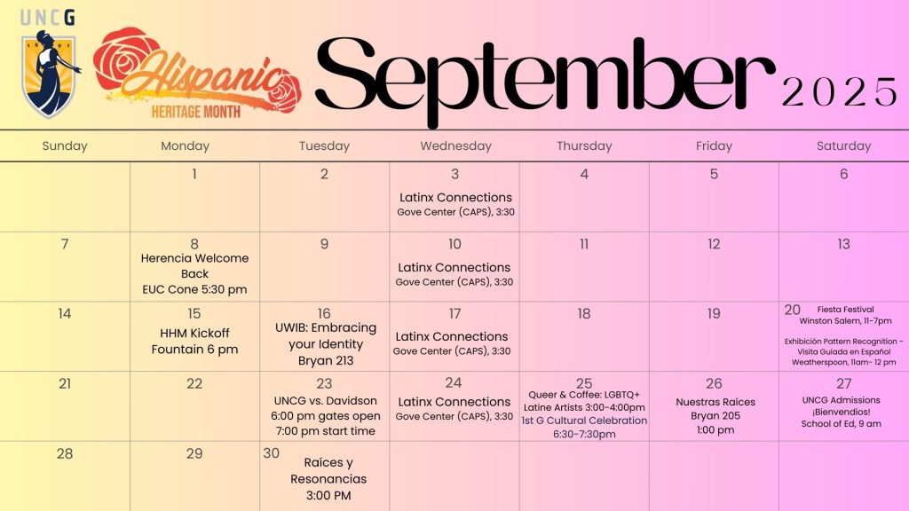| Herencia Open House | Monday 9/8/25 | 5:30 pm | EUC Cone Ballroom | Come learn all about UNCG’s Latine/Hispanic Student Collective! |