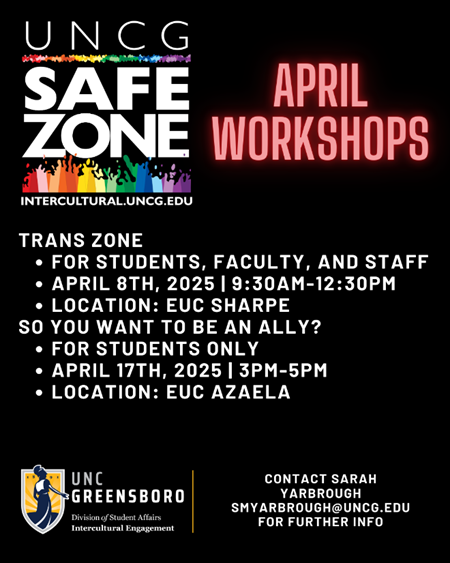 Want to learn how to be an ally for your transgender students and peers? Join the Trans Zone workshop! This workshop is open to students, faculty, and staff to learn key concepts, terminology, and actions to support transgender students across campus. Contact Sarah Yarbrough for any questions, smyarbrough@uncg.edu RSVP for Trans Zone here.